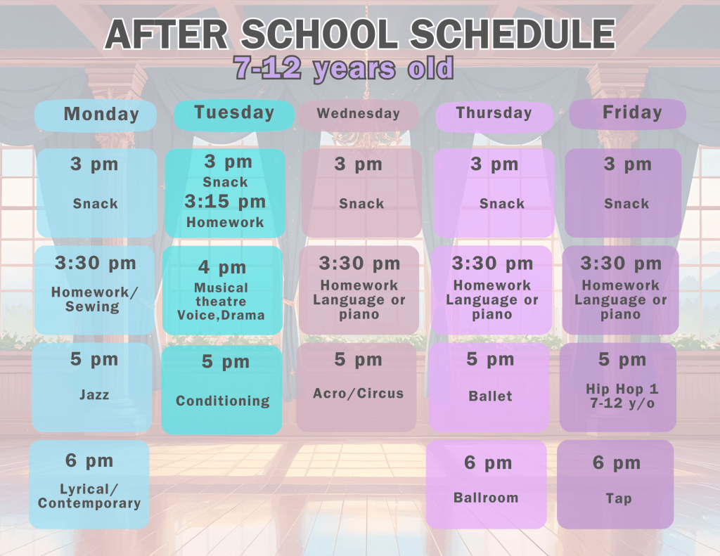 • Tuition covers all group classes, snacks, pickup, academic support, and enrichment